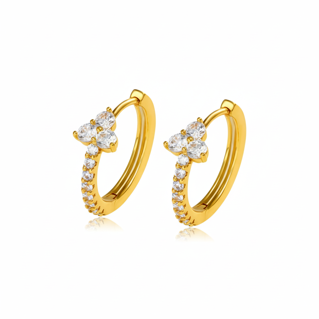 Introducing the Fashionable Gold Plated Zirconium Flower Earrings... Crafted with 24K gold plating and adorned with shimmering zirconium, these earrings showcase a beautiful flower design with three-petal elements. Their delicate style makes them an ideal choice for adding a touch of charm to your everyday look or for a special event.