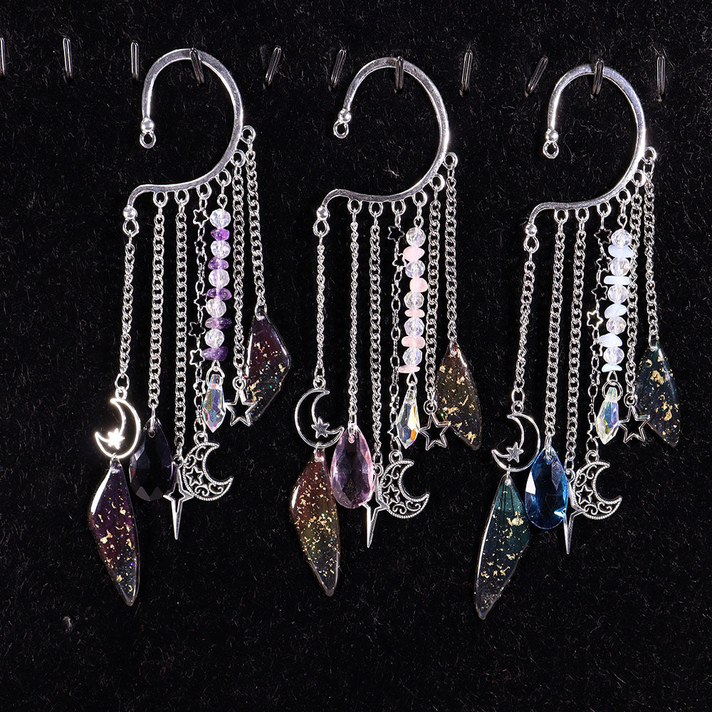 Embrace bohemian charm with our Silver Natural Crystal Gravel Elegant Ear Hook Earrings. Crafted from stunning crystals in vibrant colours—pink, blue, green, purple, sapphire blue, and red—these earrings are designed to make a statement. Their unique ear hook design adds a beautiful touch to your look. Pair them with a flowing dress or a casual top for a striking finish.