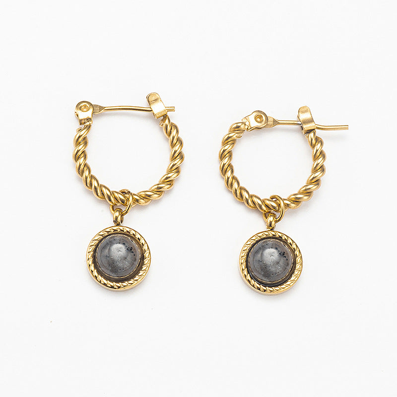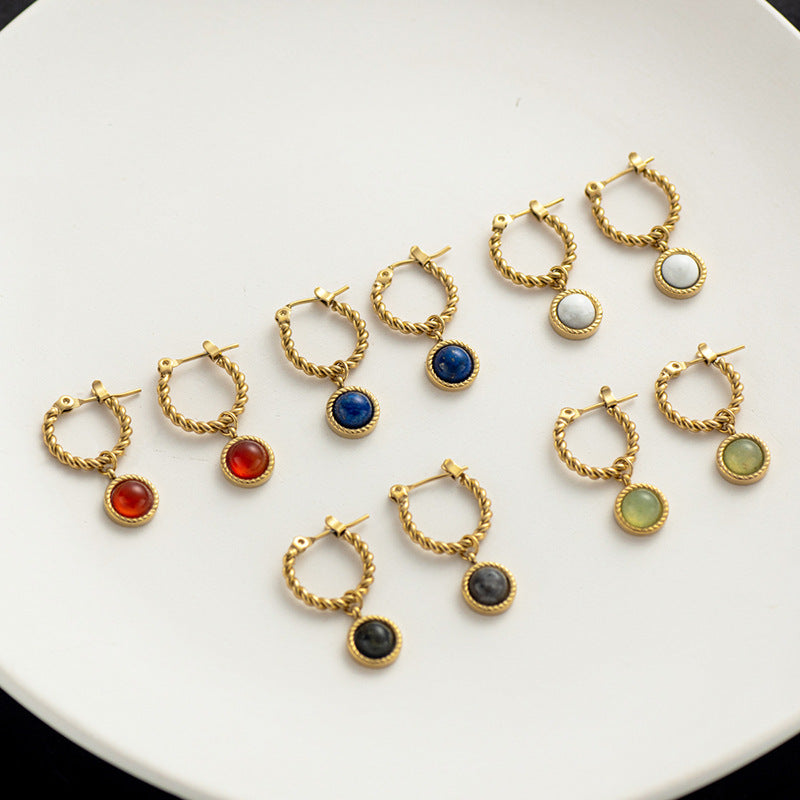 The Natural Stone Vintage Round Earrings feature unique fried dough twist designs that beautifully capture attention. Crafted from durable titanium steel, these lightweight earrings showcase a stunning gold finish. With their vintage charm, they can be styled effortlessly with both casual and dressy ensembles, making them a versatile accessory for your jewellery collection.