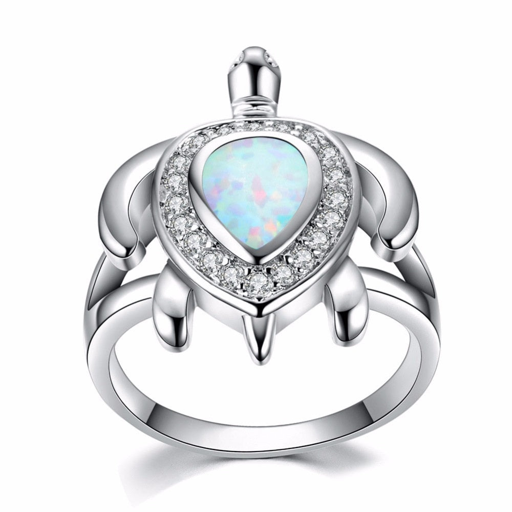 Artfully constructed, our stunning White Fire Opal Turtle Ring showcases a beautiful gold-plated turtle inlay adorned with shimmering white and blue opals. This elegant piece is crafted from high-quality metal and is available in sizes 6 to 9. Pair it with your favourite casual attire or let it shine at your next formal event for a whimsical touch.