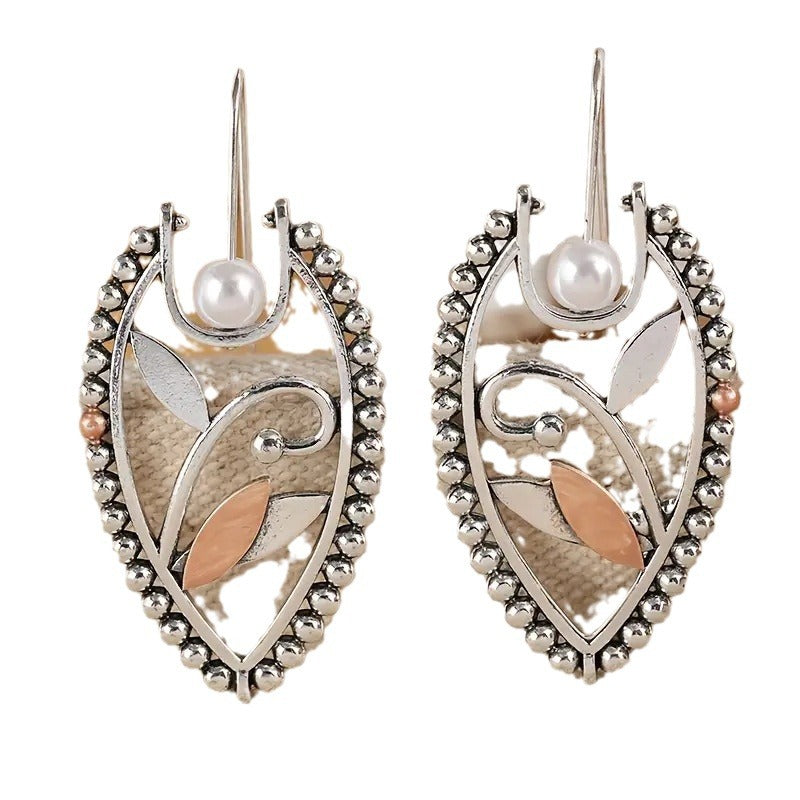 Complemented by a beautiful geometric design, these Metal Pearl Floral Leaf Carved Earrings are crafted from durable zinc alloy with sleek silver electroplating. Their stunning floral motif adds a delicate touch to your look. Perfect for pairing with a simple dress or adding flair to a casual ensemble, these earrings are a charming choice for any occasion.