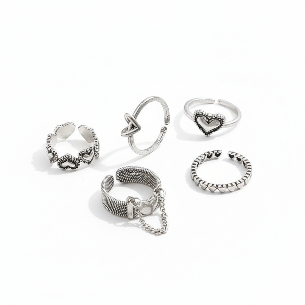 This enchanting Vintage Silver Heart Adjustable Ring Set features five beautifully crafted heart-shaped rings in a delightful mix of silver and gold tones. Made with an alloy, this stunning set showcases a unique vintage appeal. The adjustable design ensures a comfortable fit for any finger. Style these rings with your favourite casual attire for a charming touch, or wear them together for a bolder statement.